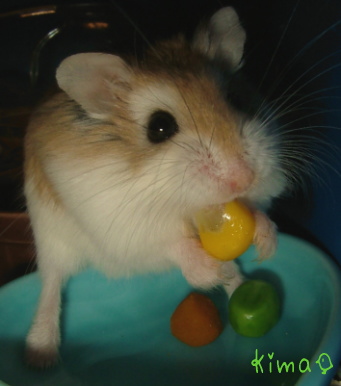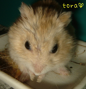 『歯 切られちっただよー。もぐもぐ』 今朝、病院に行ってきたので、診断の結果を簡単に。 目→薬で治まったということは、やっぱり炎症を起こしていた。 軟便→薬があわないのか、ストレスか。薬をやめて普通に戻ったなら、どっちにしろ飲み薬はもうあげなくていい。 おハゲ→可能性として考えられるのは、まず、飲み薬がついちゃって気になった、はたまた上の歯が伸びてそれが気になる。もう一つは、歯がジャマして頬袋の中身が取りづらいために、よけい掻いちゃう。 とのことです。 虎は上の歯が伸びちゃうため、考えられる原因も増えちゃいます。まだ、キケンなほどに伸びてはいなかったけど、野菜も食べにくそうにしてるし、ペレットの残りも目だってきてたから、歯を切ってもらいました。 新しい病院の先生、歯を切るのがお上手。前の先生がヘタだったのかしら?昔は切り口がナナメってたりして、余計に辛そうだったこともあったんです。あと、1週間ほど目薬をさして、それで治ればおめめは完治♪歯を切って、スッキリしたのか、今日はモリモリ食べてます。 そうそう・・・急に具合が悪くなった虎の写真に入ってる名前に“なんか魂が抜けちゃった~”なワンポイントをつけているのがイヤで、ハートにしました。