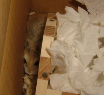 『ナイナイ・・・・・デキナイ』 写真は、ケージ掃除が終わり、ダンボールシェルターからおうちに帰る途中のキマ。(お迎えの時の箱が移動専用のエレベーター) あわあわしていたら、カメラが見えたもんで“ナイナイ”忘れて警戒態勢。 すくすく育てよ、木豆さん。