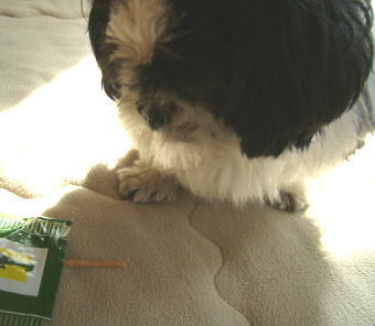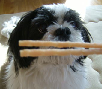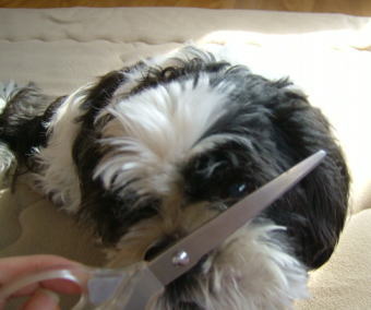 『このハサミで切るのか?これは、いつものハサミじゃないな??』 はっ!!バレたっ!!! 1階までカット用のハサミを取りに行くのがメンドーだったため(←チームものぐさ:只今メンバー独りきり。随時募集中!)、普通の紙きりハサミで切ろうとしたわたし。普段のハサミなら「スンスン」くらいの確認で終わるのに、今回は長いことニオイを嗅いでおられました。 さて、カット開始! チョキチョキ・・・チョキチョキ・・・・・(あ、こっちが短い:心の声)・・・・・チョキチョキ・・・・・・「動かないでね。ここ切るよ~」←コタしゃんへの呼びかけ・・・・・チョキチョキ・・・・・・・(あ、やば、切りすぎて変な顔になっちった。まぁいっか。わたしの顔じゃないしぃ)・・・・・・・チョキチョキ・・・・・・。 と、こんな感じでカットします。1分もすれば飽きちゃうコタしゃん。モジモジするものの「危ないから動かないで」と言うと、じーっとします。 そして、かわいい顔に仕上げようとがんばるものの、途中でわたしも飽きます。 たまにすごいやつれた顔に仕上がることもあるけど、そこは本人の可愛らしさでカバーしてもらうことにしています。 カットが終わると、ご褒美タイム。 さて、ジャーキーをどうぞ。